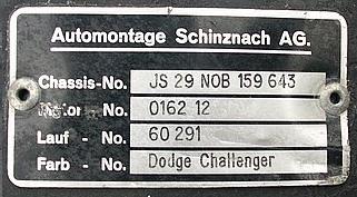 A second item worthy of mention is the VIN tag - the character seperation is not what Moparites are used to seeing, and in fact, are identical to the French-built Challengers.The tags were possibly a European mandate, as the Challenger Special was in Switzerland at the time of its conception.